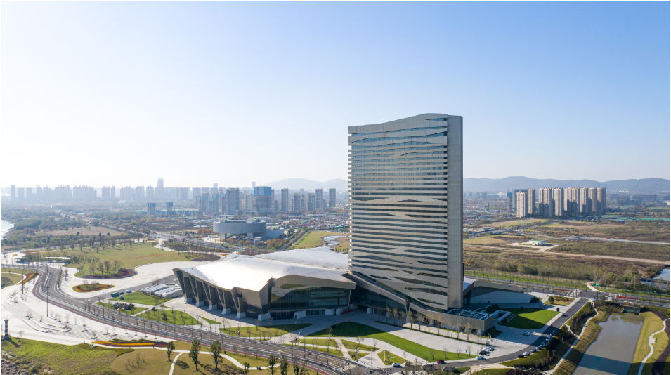 南京扬子江国际会议中心按照国家级会议标准设计,主要分为会议中心和酒店两部分,总建筑面积18.72万平方米,楼体高度约157米。场馆整体造型灵感选自南宋画家马远的“水图十二卷”之“层波叠浪”,充分融合江边风景,处处体现层波叠浪、扬帆起航的意境,宛如一艘巨轮乘风破浪,也象征着力量、生机、茁壮和锐意进取的精神。场馆内部包含功能丰富、设施完备的空间,其中,会议中心内的主会场2800平方米,主展厅8750平方米,同时配备了多种类型的会议厅和贵宾室;酒店共计35层,拥有338间客房,特色餐厅以及康体中心等多样化功能的厅室,可以满足各类宴、会、展需求。