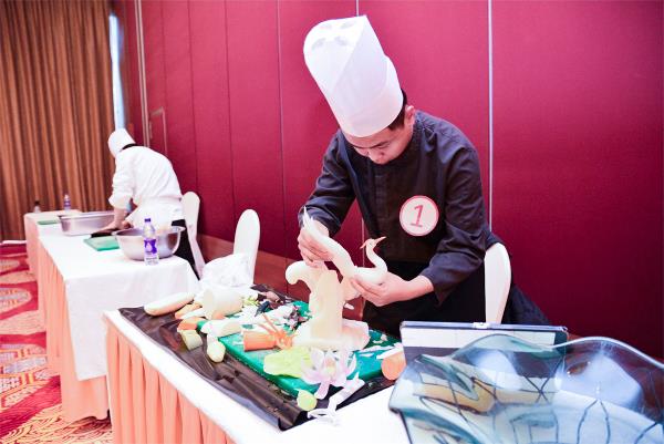 今年创新推出的蔬果雕刻竞赛项目,激烈角逐持续180分钟,厨师们用一双双巧手将普通的蔬果雕刻成精美的艺术品,同时赋予极具内涵的造型设计,展示出了精湛的技艺和酒店的文化理念。