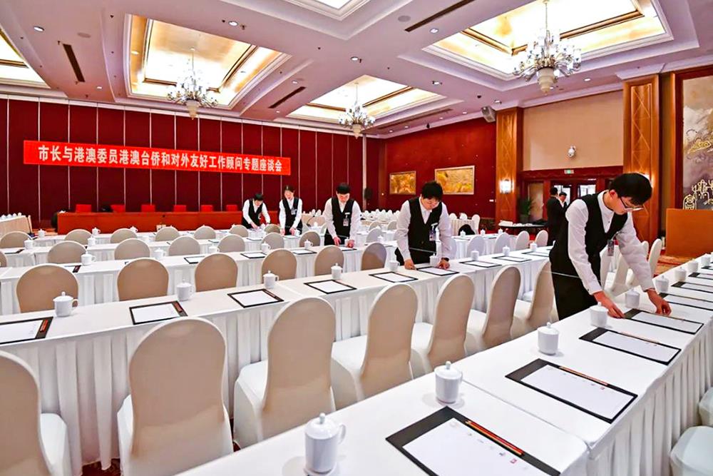 会务保障方面,酒店结合每场会议对参会人数、会议台型、茶水需求等不同要求,及时准备物资布置会场,调试多媒体和音响设备,在桌椅、纸笔的摆放上进行调整,确保为每场会议提供专业舒适的会场。